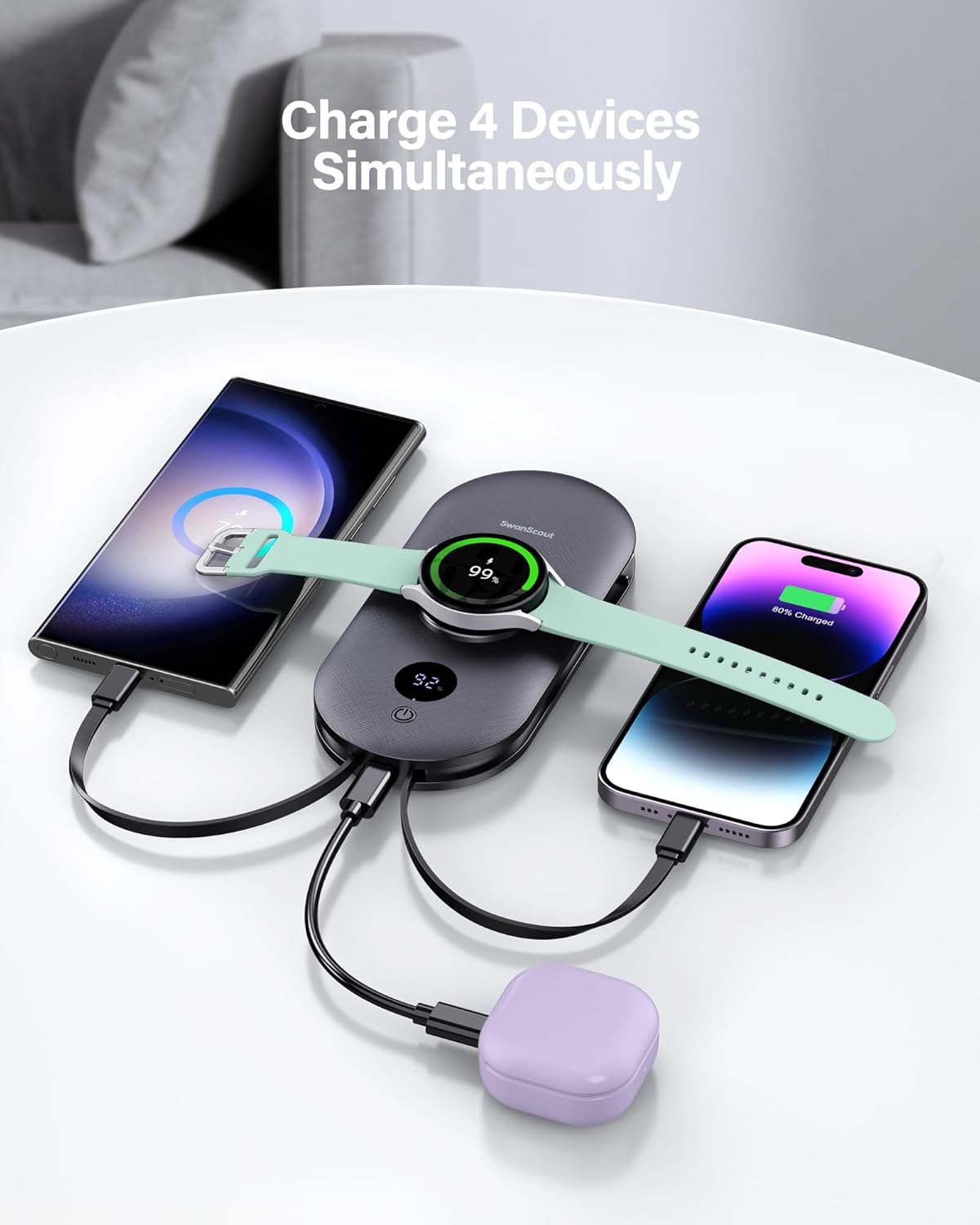 | Whats in the box | Built-in cables for all phone types, AC wall plug |